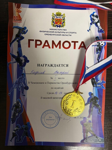 Валерий, заняв 1 место среди юношей 16-17 лет в весовой категории 63.5 кг, стал чемпионом, в связи с чем в ноябре 2025 года он будет представлять нашу область на Чемпионате и Первенстве России по муай тай в Приволжском и Уральском федеральных округах.