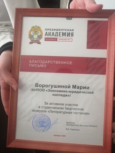 Студенты нашего экономико-юридического колледжа тоже были приглашены на Гала-концерт. Мероприятие было организовано на высшем уровне! Студентка 1 курса Мария Ворогушина награждена благодарственным письмом в номинации "Художественное слово", с чем ее и поздравляем, желаем творческих успехов!