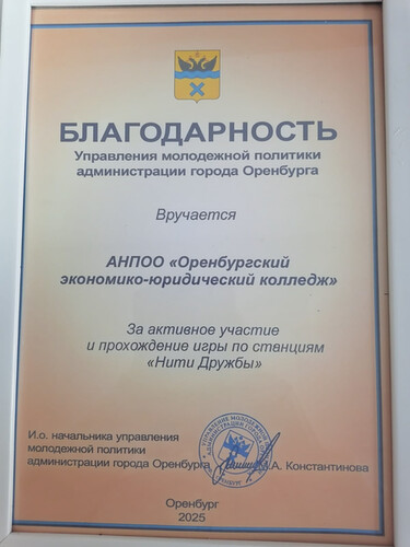 26 сентября 2025 года Управление молодежной политики организовало квест-игру «Нити дружбы», направленную на формирование у молодежи чувства личной ответственности и сопричастности к сохранению мира и традиций многонационального Оренбуржья. Сборная команда студентов первого курса Оренбургского экономико-юридического колледжа под руководством преподавателя Кира Сергеевна приняла участие в мероприятии.