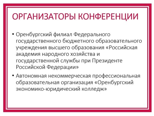 Организаторами конференции выступили Оренбургский филиал Федерального государственного бюджетного образовательного учреждения высшего образования «Российская академия народного хозяйства и государственной службы при Президенте Российской Федерации»