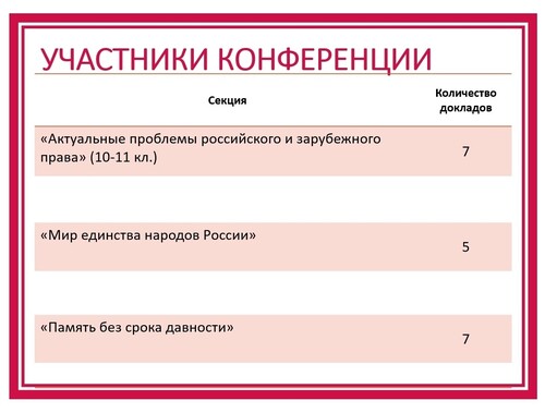 В ходе работы секционных заседаний участники конференции рассмотрели широкий спектр актуальных вопросов: о традиционных праздниках, культуре и языке народов России. Отдельного внимания заслуживают вопросы правового регулирования абортов, о ДНК-экспертизе и судебных ошибках (может ли современна наука сделать смертную казнь "безошибочной"), о правовом регулировании криптовалют, о правовом статусе участников Специальной военной операции и членов их семей в трудовых правоотношениях.
