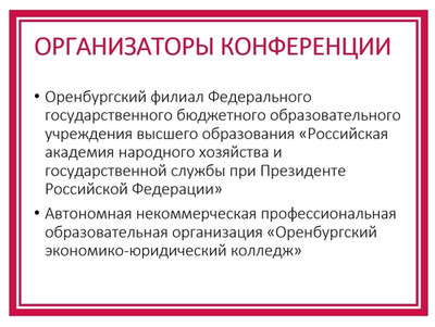 (orn.ranepa.ru/) и Автономная некоммерческая профессиональная образовательная организация «Оренбургский экономико-юридический колледж» (orlc.ru/) при поддержке